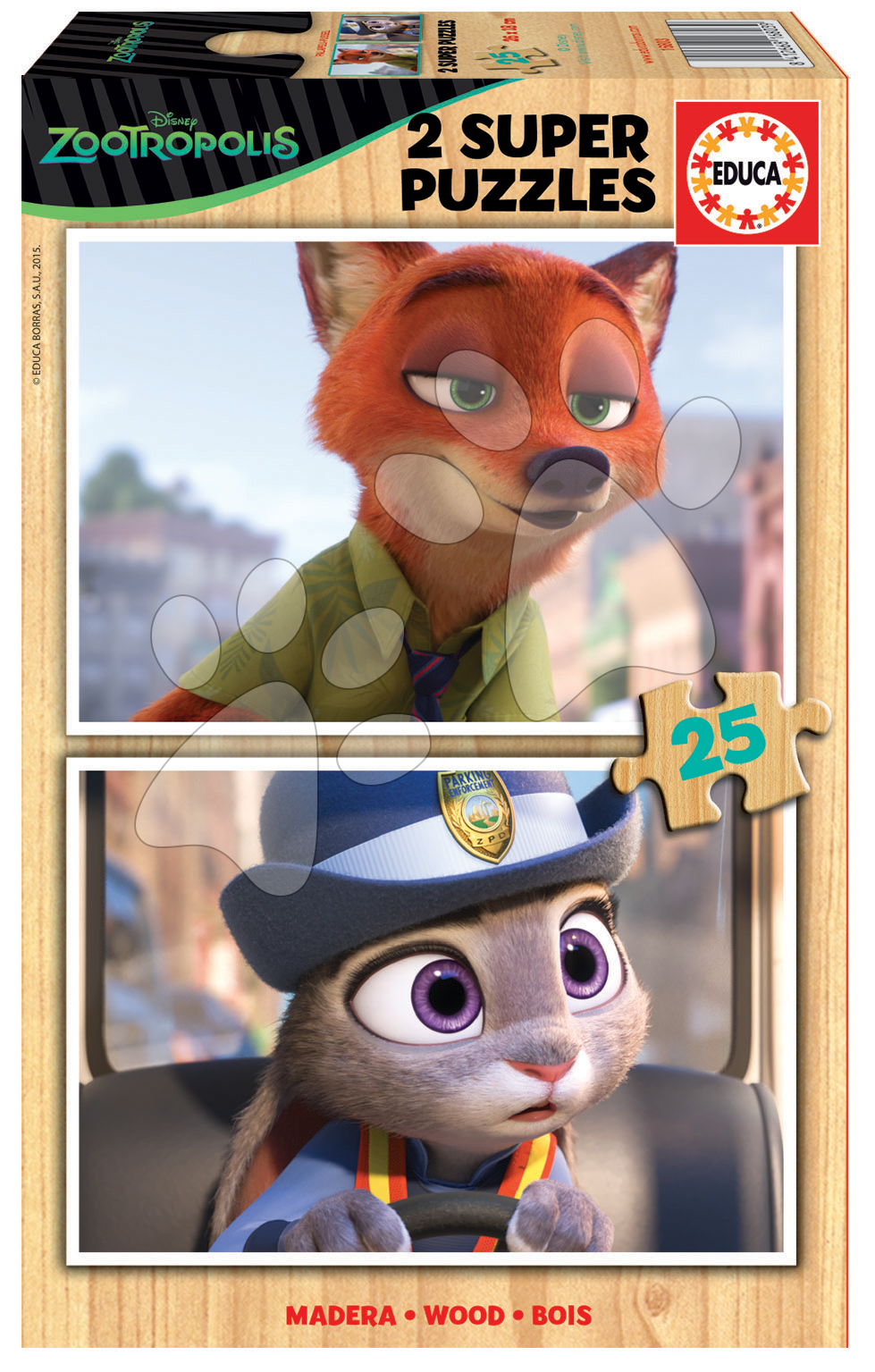 Dětské dřevěné puzzle s motivem pohádky Zootropolis budou chtít všechny vaše děti. Motiv těchto puzzle je ze známé pohádky o městečku, ve kterém žili pouze zvířata. Balení skládačky obsahuje dva obrázky, z nichž každý obsahuje 25 dílků (2x25 dílů). Pohádkové puzzle jsou vyrobeny z kvalitního dřeva. Splňují bezpečnostní standardy - jsou bezpečné pro děti. Tyto dřevěné puzzle jsou polepené hezkými veselými obrázky s motivem z oblíbené pohádky.