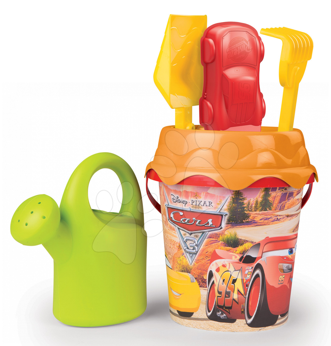 Kbelík set Smoby je krásná souprava hraček, která je ideální pro hru v písku nebo ve vodě. Součástí soupravy je kbelík s obrázkem oblíbené pohádky Auta 3. Kbelík má na vrchu sítko. Kromě kbelíku s obrázkem legendárního autíčka McQueen v setu najdete i hrabičky a lopatku spolu s bábovičkami. Při vytváření uměleckých děl v písku dítě využije i malou konvičku.