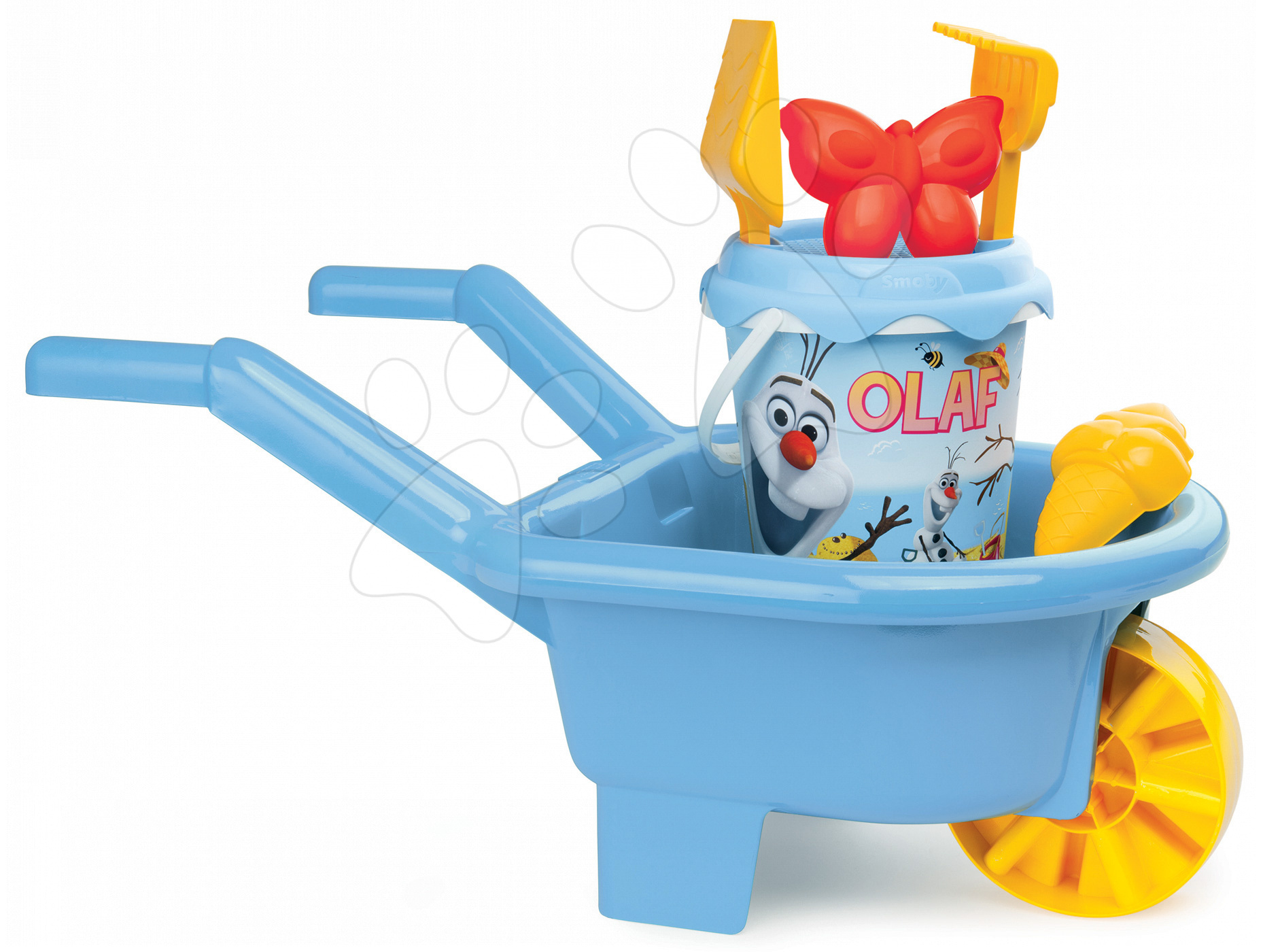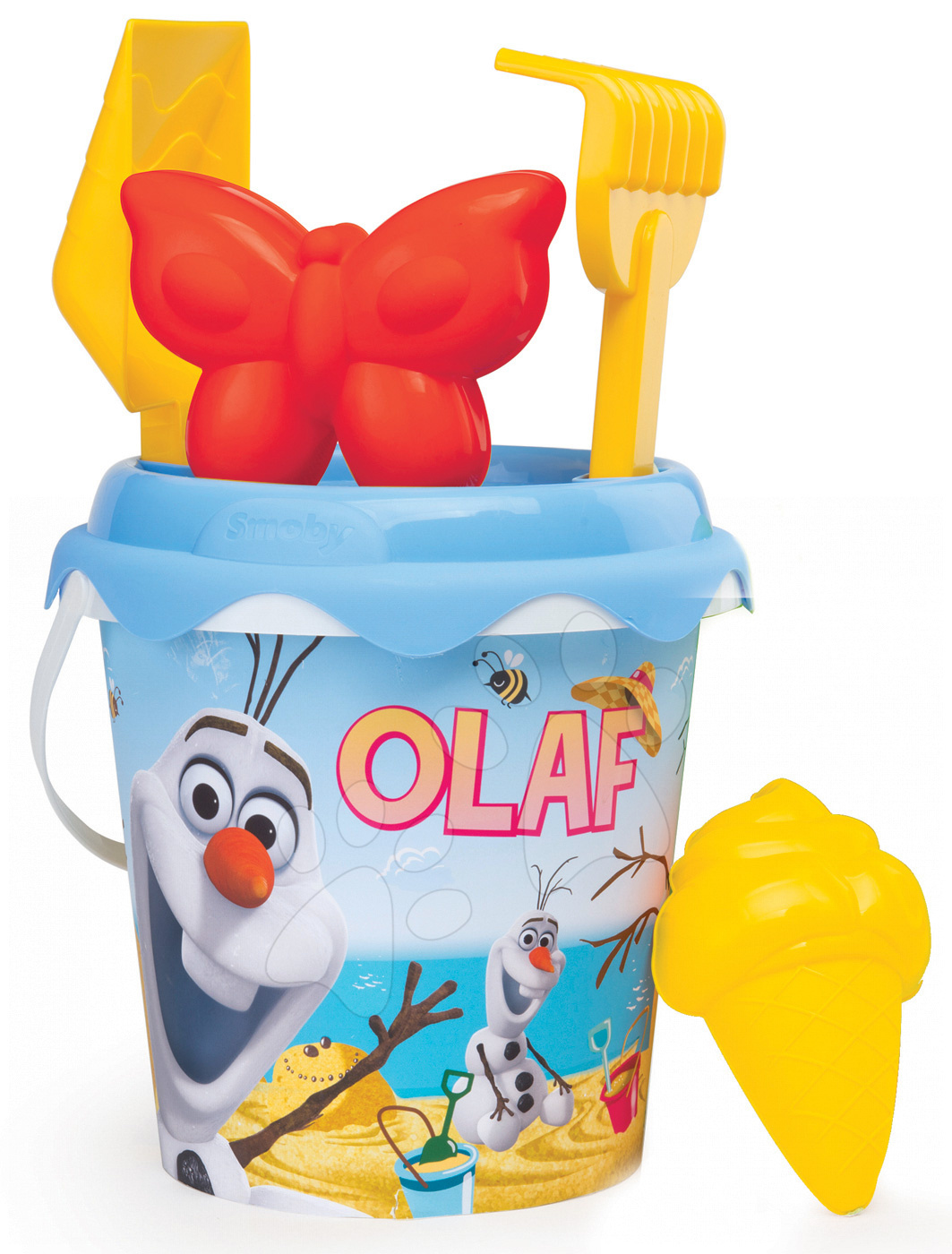 Kolečko Smoby je krásná hračka do písku pro všechny děti. Má jemnou modrou barvu a výborně se doplňuje s kbelíkem a formičkami. Má jedno kolečko, manipuluje se s ním velmi jednoduše. Kbelík set Smoby je krásná souprava hraček, která je ideální pro hru v písku nebo ve vodě. Součástí soupravy je kbelík s obrázkem milého sněhuláka Olafa, který je velmi známý z pohádky Frozen (Ledové Královští). Kbelík má na vrchu sítko na prosévání písku. Děti se prostřednictvím kolečka mohou hrát na zahradníky nebo jej využít k přenášení jiných hraček či nákladu.